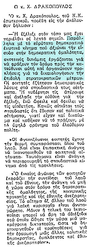 A newspaper clip from the condemnation coming from a communist party speaker. The highlighted part reads "In parallel with the larger democratic unifying movement which promotes the entrance into democratic normality, dark forces are working to block the road to that direction and organize challenges so that the imposition of military measures are justified"